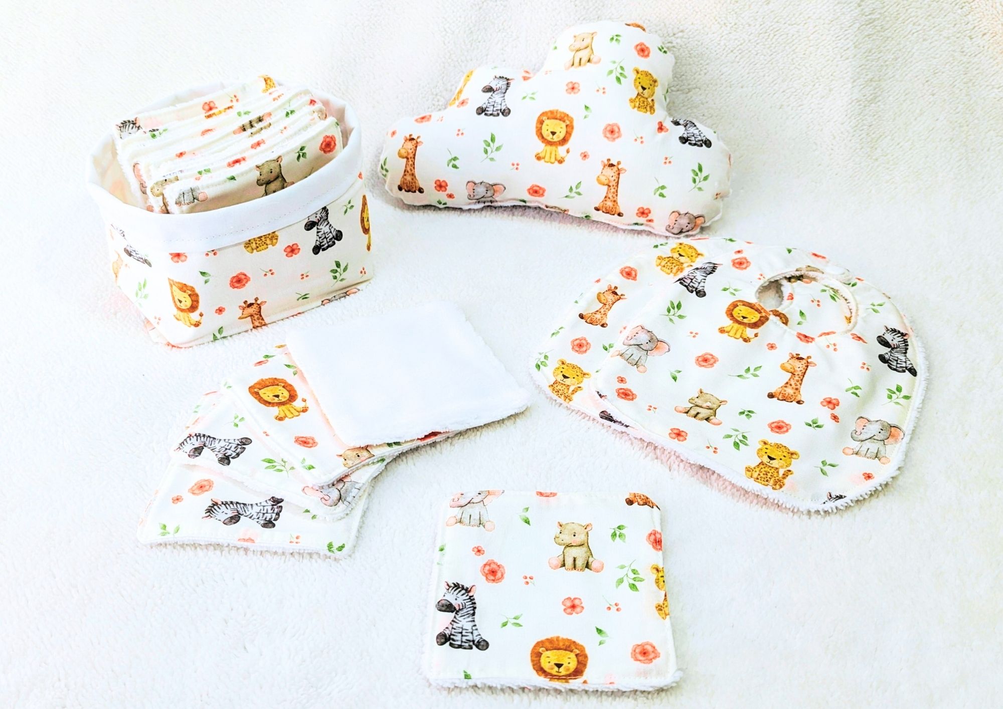 Enfin, le coffret est complété par deux bavoirs assortis (22 x 17 cm), doublés en tissu absorbant pour gérer les petits incidents durant les repas. Ces bavoirs se ferment facilement grâce à une pression, simplifiant leur mise en place et leur retrait. Le confort de bébé ne sacrifiant rien à l’esthétique, ces bavoirs sont autant pratiques que ravissants.