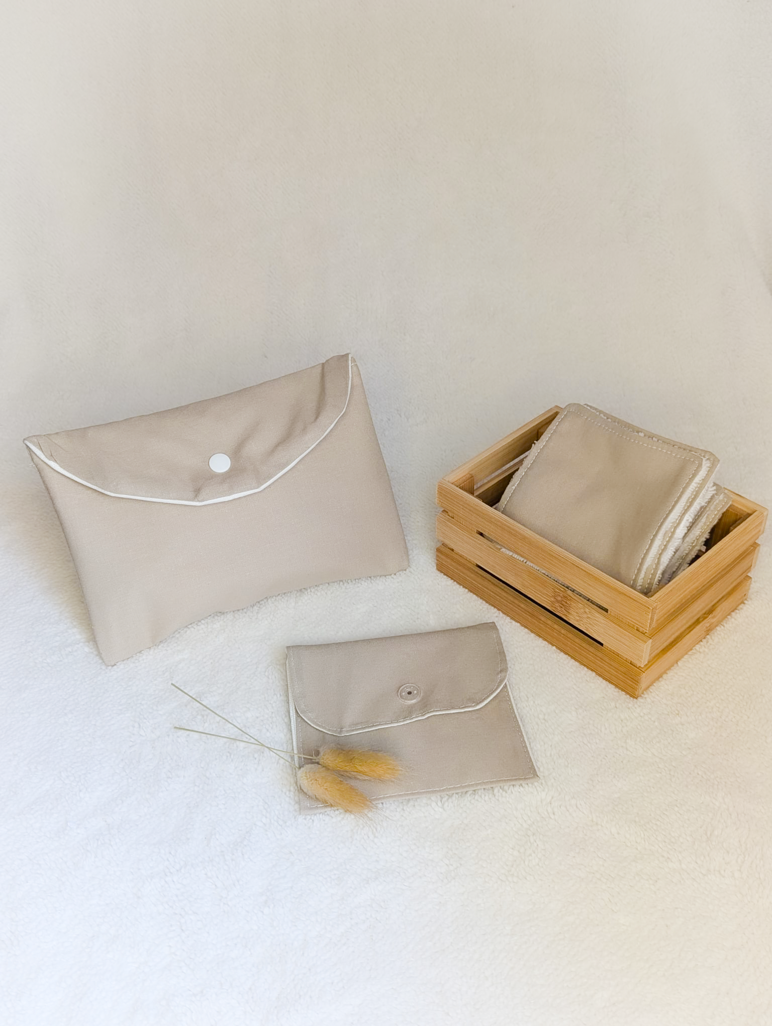 • 1 petite pochette assortie (11 x 12 cm) – parfaite pour savon, cartes ou protections hygiéniques