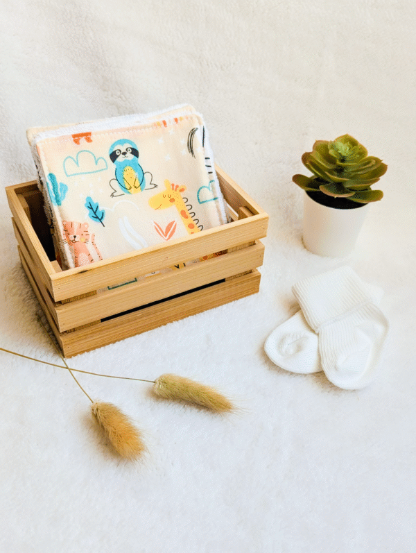 Nos lingettes ne sont pas seulement fonctionnelles, elles ajoutent une touche esthétique à votre quotidien. Disponibles en designs charmants et en tailles pratiques, elles s’adaptent parfaitement aux besoins des parents et des bébés. Faciles à laver et rapides à sécher, elles sont prêtes à être réutilisées en un clin d’œil, rendant leur usage simple et agréable.